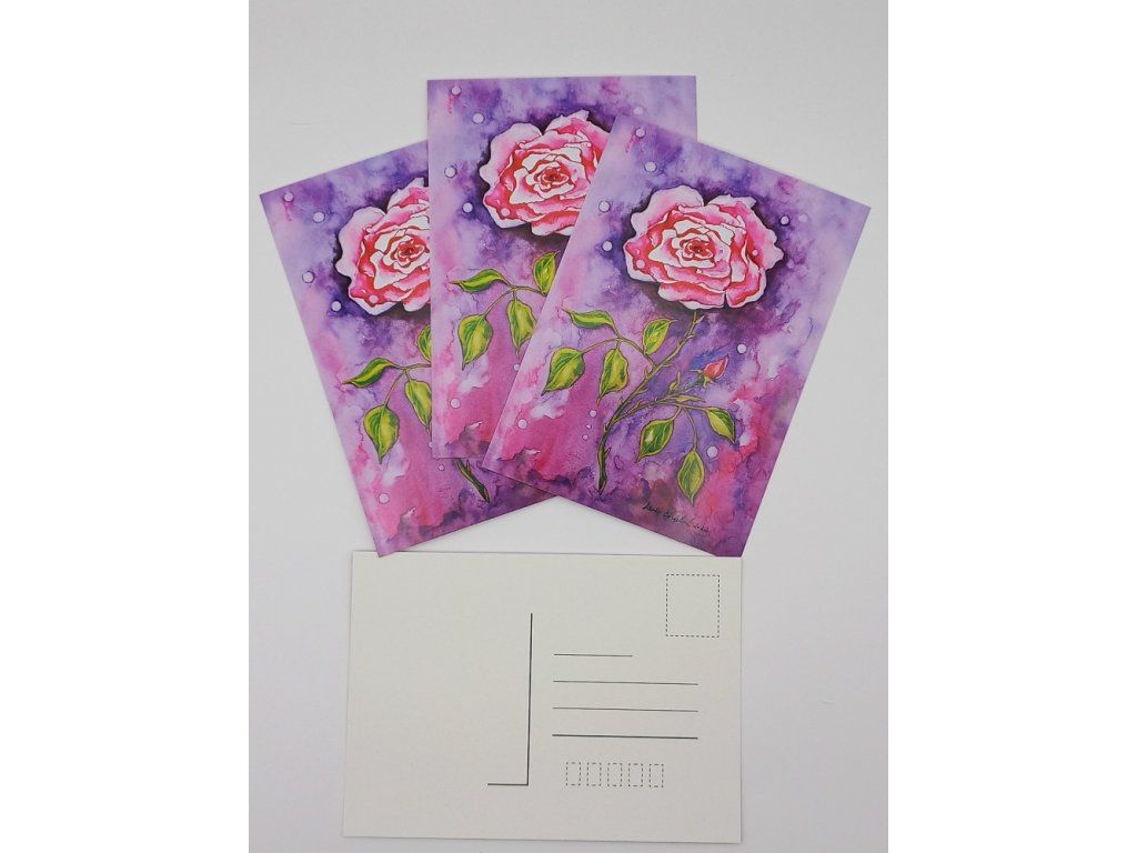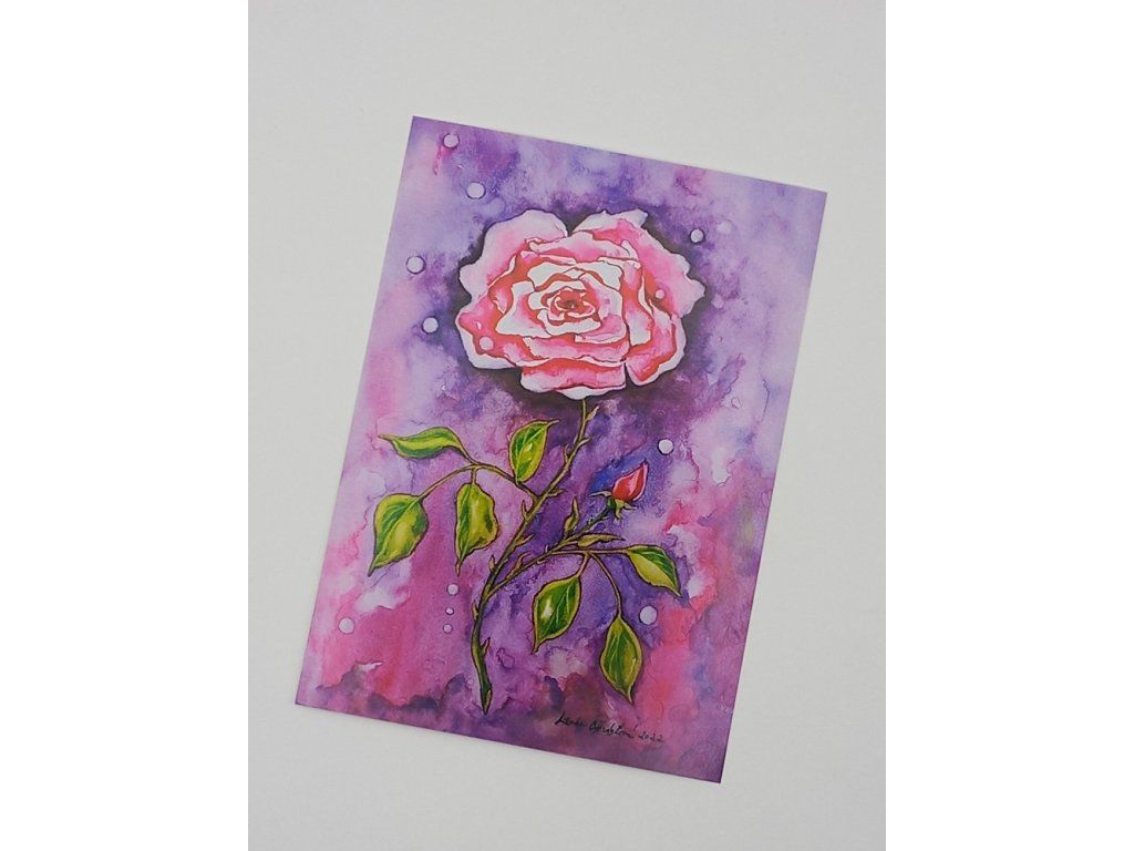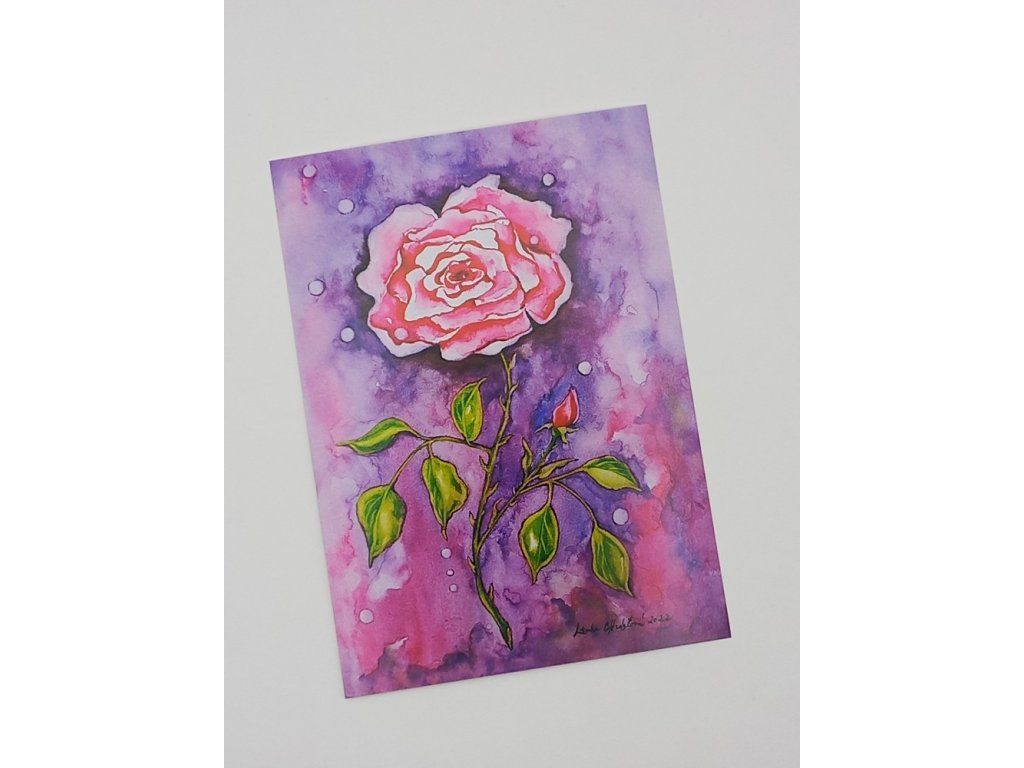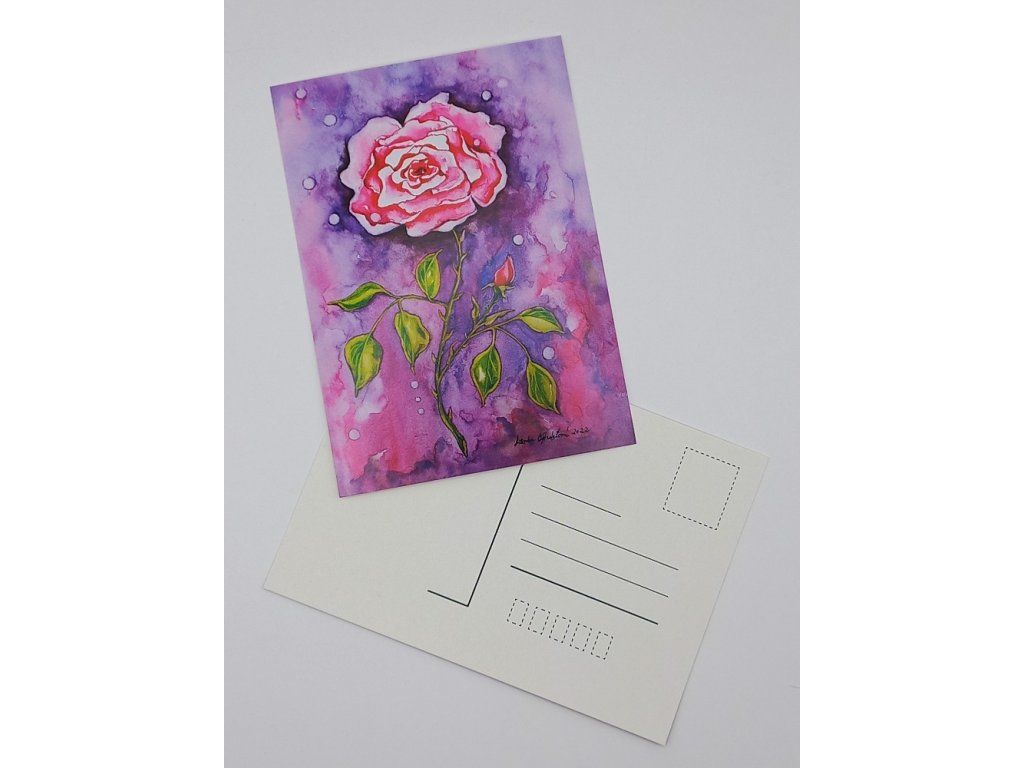 Jedná se o reprodukci na pohlednici, velikosti A6. Originální motiv vznikl rukou autorky ve formátu A4 a je přenesen na pohlednici z kvalitního polomatného papíru. Motiv růže podtrhuje něžnou krásu květiny.