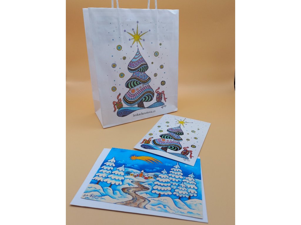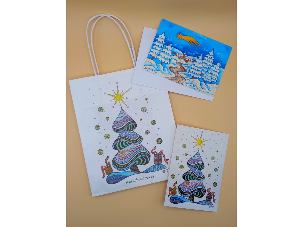- Dárkovou tašku „Vánoční stromek“. Rozměr: 180 × 225 × 80 mm. Materiál: bílý kraftový papír, kroucené bílé ucho – pohodlné do ruky. Potisk: reprodukce originálního akvarelového obrazu na jedné straně, ostatní strany jsou bílé.