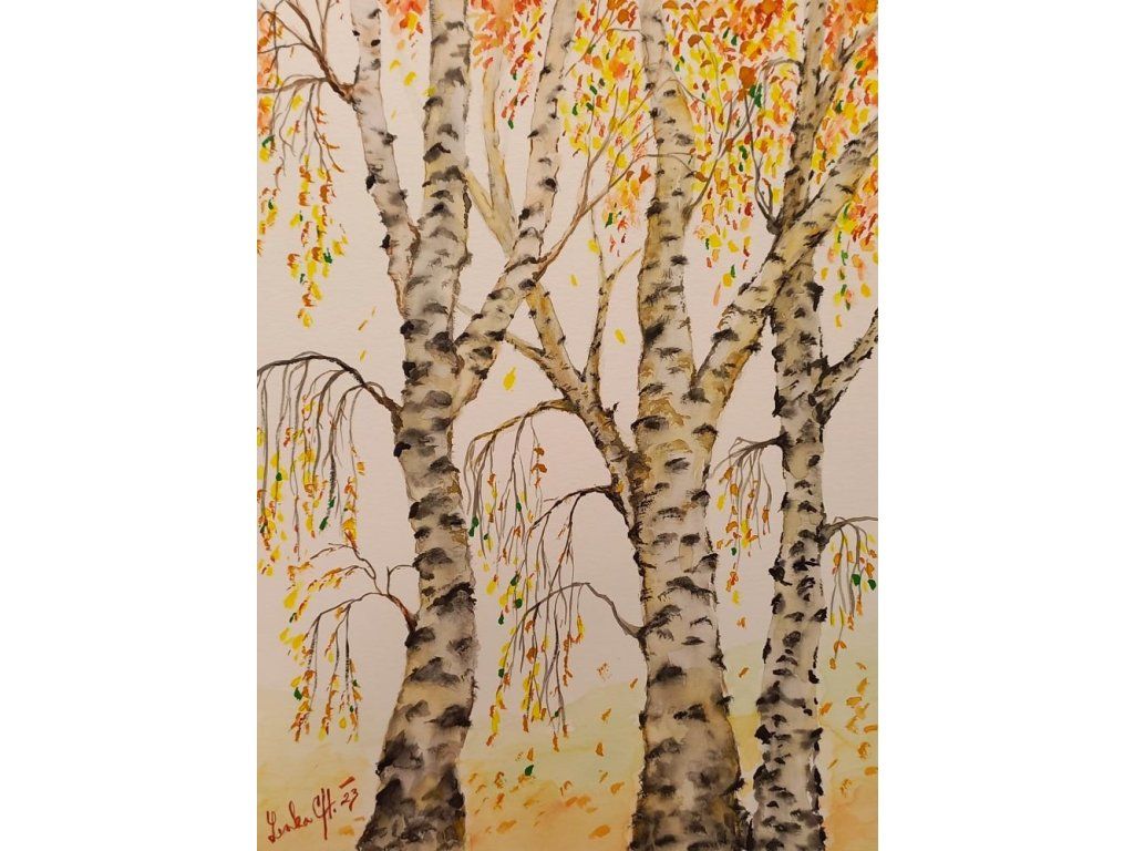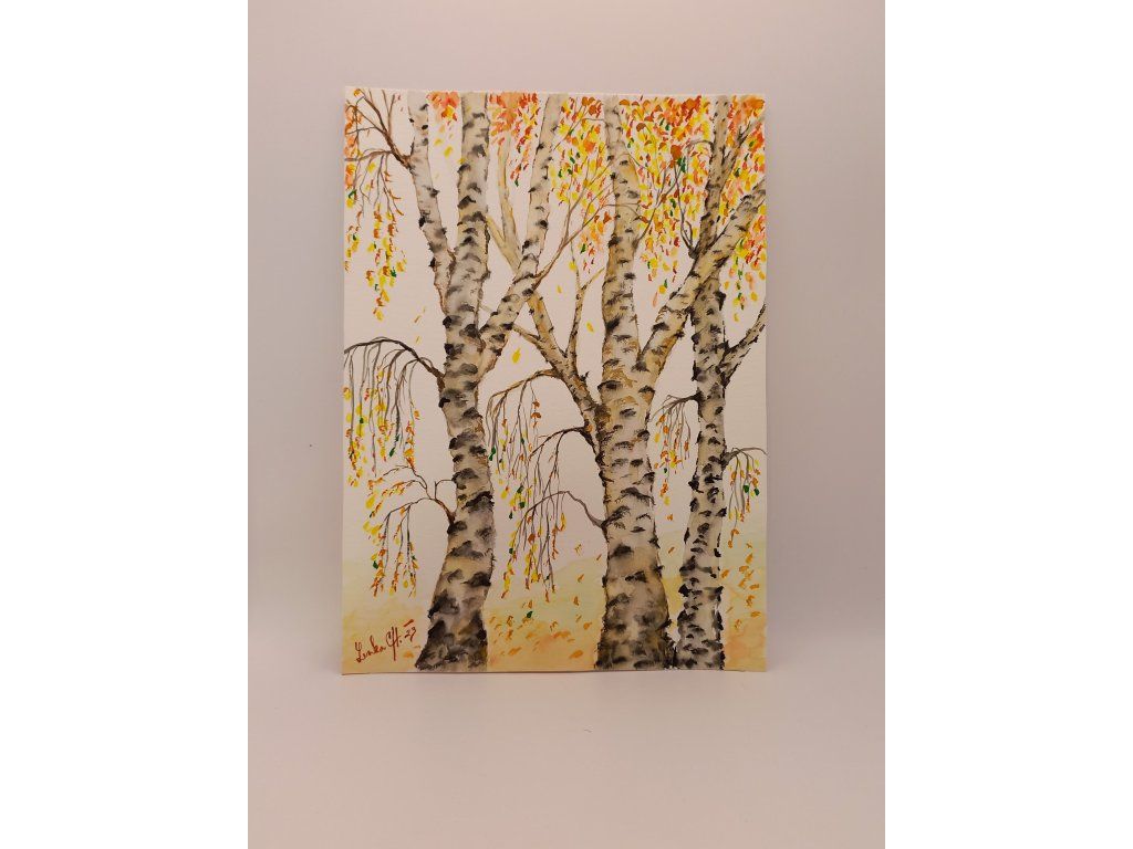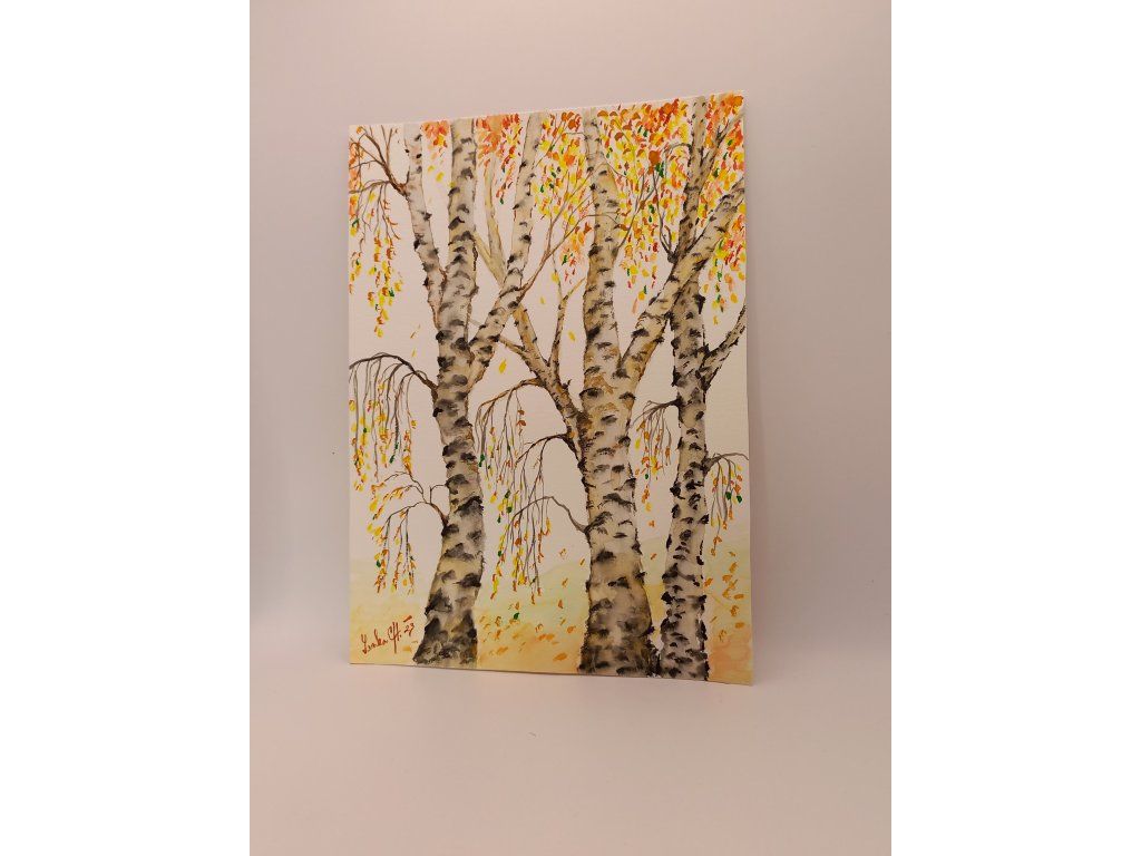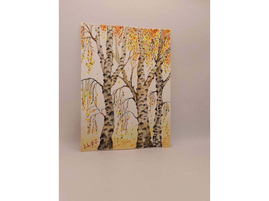 Břízové trio – originální akvarelový obraz formátu A4 (21 × 29,7 cm), inspirovaný podzimní proměnou přírody. Motiv tří elegantních bříz s listy v odstínech zlaté, hnědé a zelené zachycuje kouzlo měnících se ročních období. Jemná technika akvarelu dodává kompozici lehkost a vzdušnost, zatímco přírodní barevnost evokuje klid a rovnováhu.