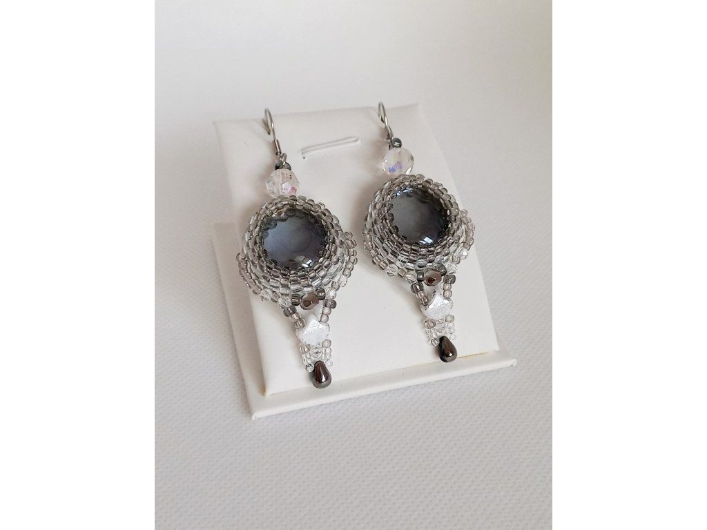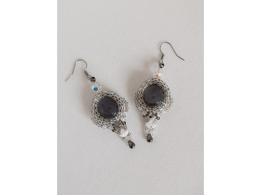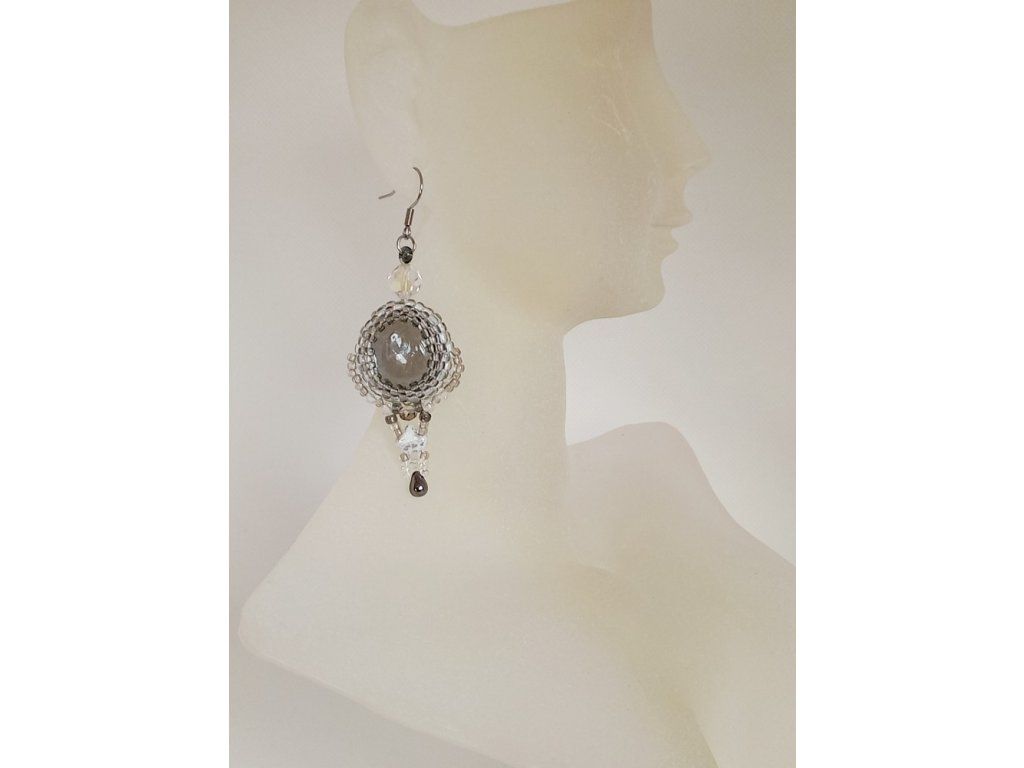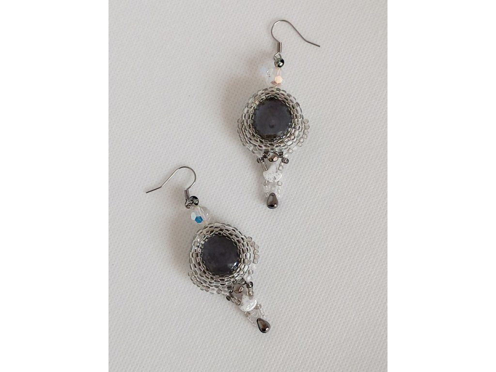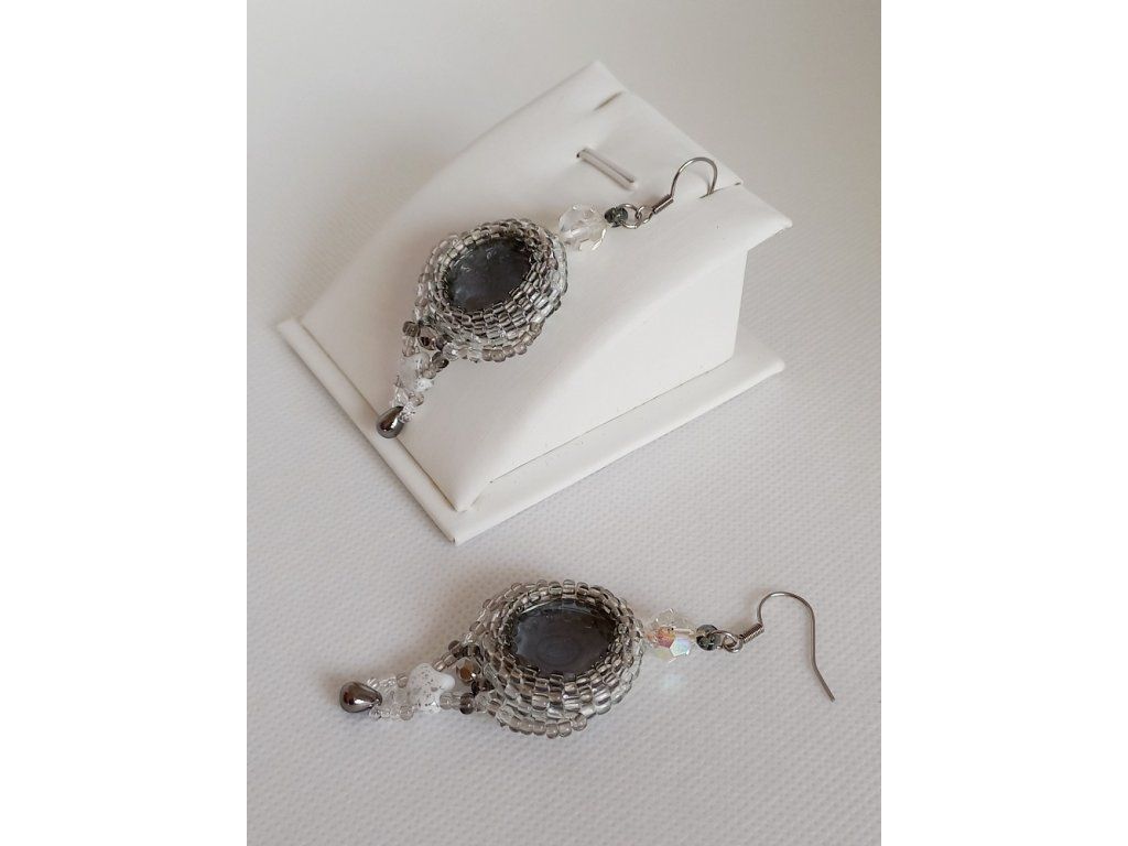 Dominantou je obšitý skleněný kabošon o průměru 2,5 cm, doplněný šedým a čirým rokajlem, broušenými ohňovkami a korálky Matubo Ginko silver splash–white. Spodní část zdobí mačkaná kapka v černo‑stříbrné barvě.Dominantou je obšitý skleněný kabošon o průměru 2,5 cm, doplněný šedým a čirým rokajlem, broušenými ohňovkami a korálky Matubo Ginko silver splash–white. Spodní část zdobí mačkaná kapka v černo‑stříbrné barvě.