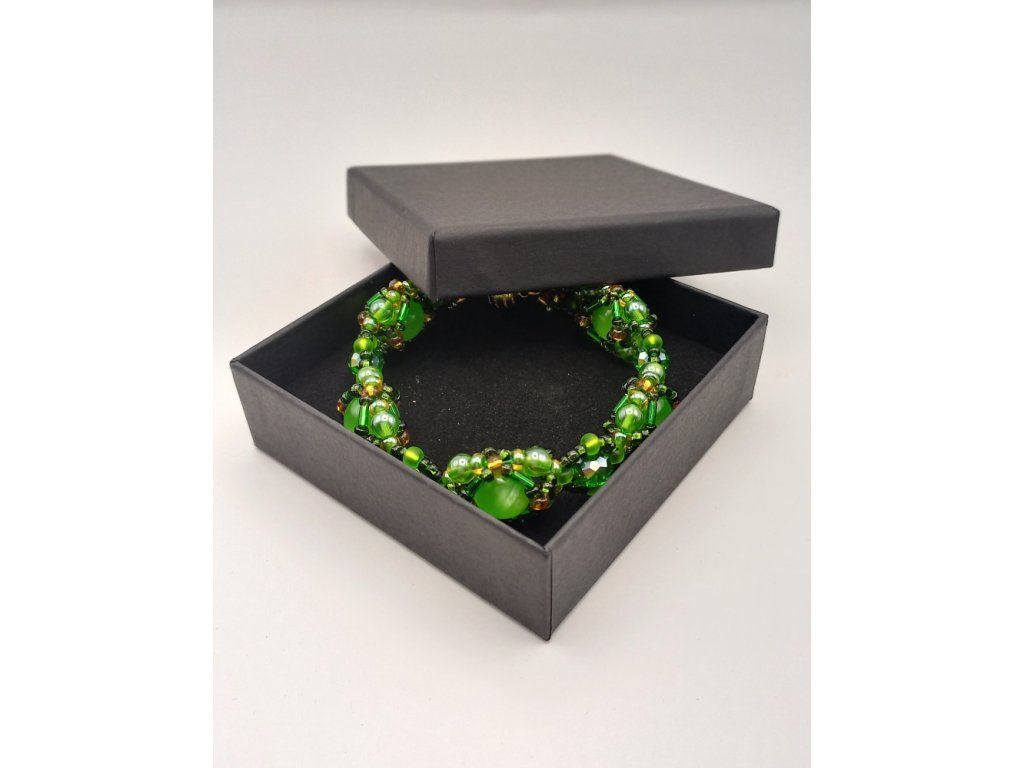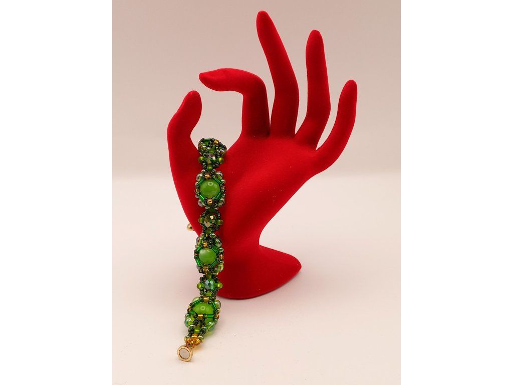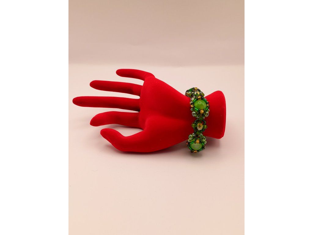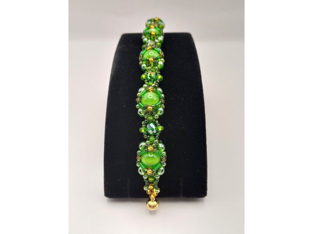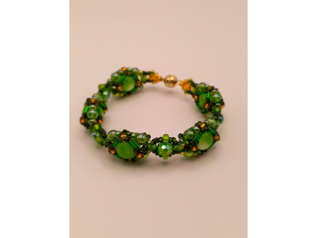 Náramek odráží tajemství lesa – jeho zlatavé paprsky slunce prorážející mezi listy, smaragdovou svěžest mechu a odlesky rosy na kapradí. Šitý z korálků v zelené a zlaté barvě, které spolu tvoří harmonické spojení evokující přírodní krásy.