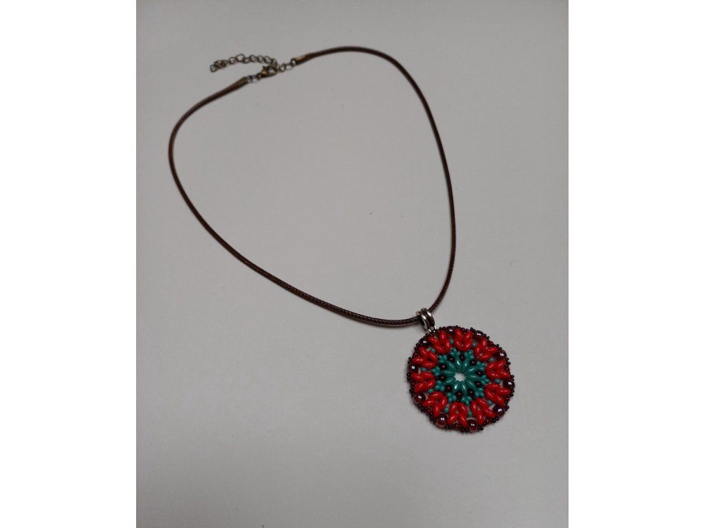 Elegantní náhrdelník s přívěskem o průměru 4 cm, zavěšený na hnědé kožené šňůrce. Harmonická kombinace červené, šedomodré a hnědé symbolizuje propojení se zemskou energií, stabilitou a vnitřní rovnováhou. Stylový doplněk inspirovaný přírodními prvky a hlubokým duchovním významem. Vytvořeno precizní šitou korálkovou technikou beadweaving, která dodává šperku jedinečnou strukturu a eleganci. Vhodná pro ty, kteří hledají rovnováhu, inspiraci a spojení s přírodními energiemi. Skvěle doplní osobní styl milovníků originálních ručně vyráběných šperků a těch, kteří oceňují hlubší symboliku v doplňcích.