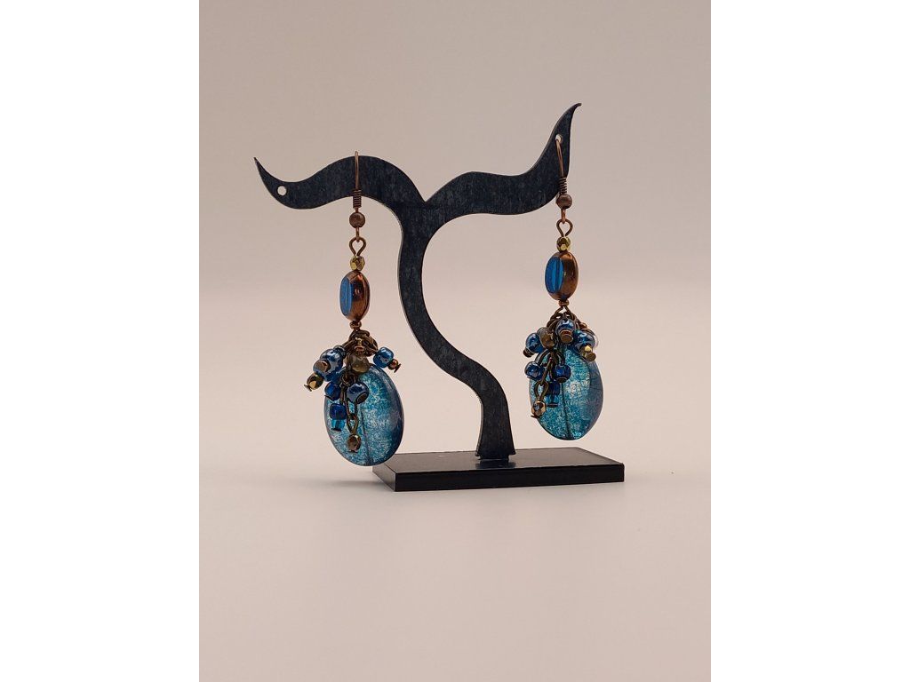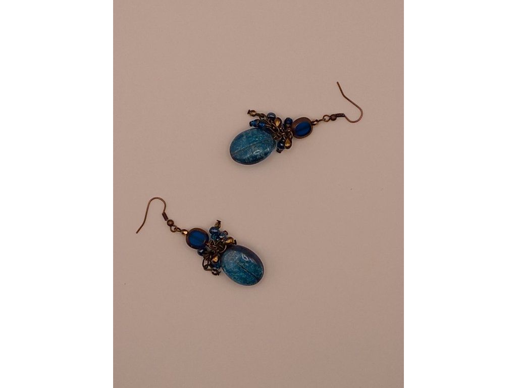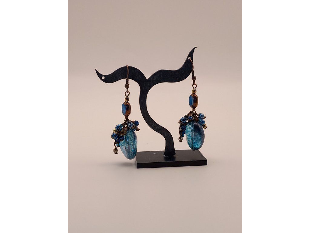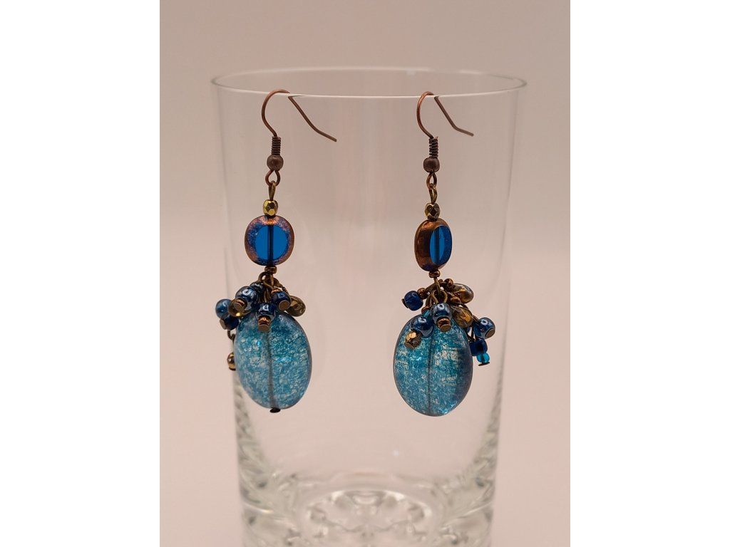 Nádherné náušnice „Modrá symfonie“ působí jako ladná skladba, která propojuje průsvitné modré oválné korálky o velikosti 2 × 1,5 cm s hlubokými tóny tmavě modrých skleněných korálků. Celek je podtržen tmavě měděnými komponenty, které dodávají šperkům nádech elegance a nadčasovosti. Náušnice jsou zavěšeny na praktických afroháčcích s bezpečnostní zarážkou, což zajišťuje pohodlné nošení.