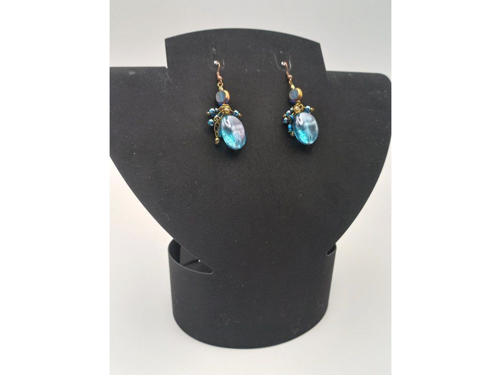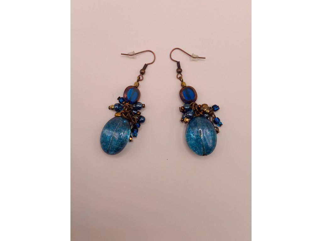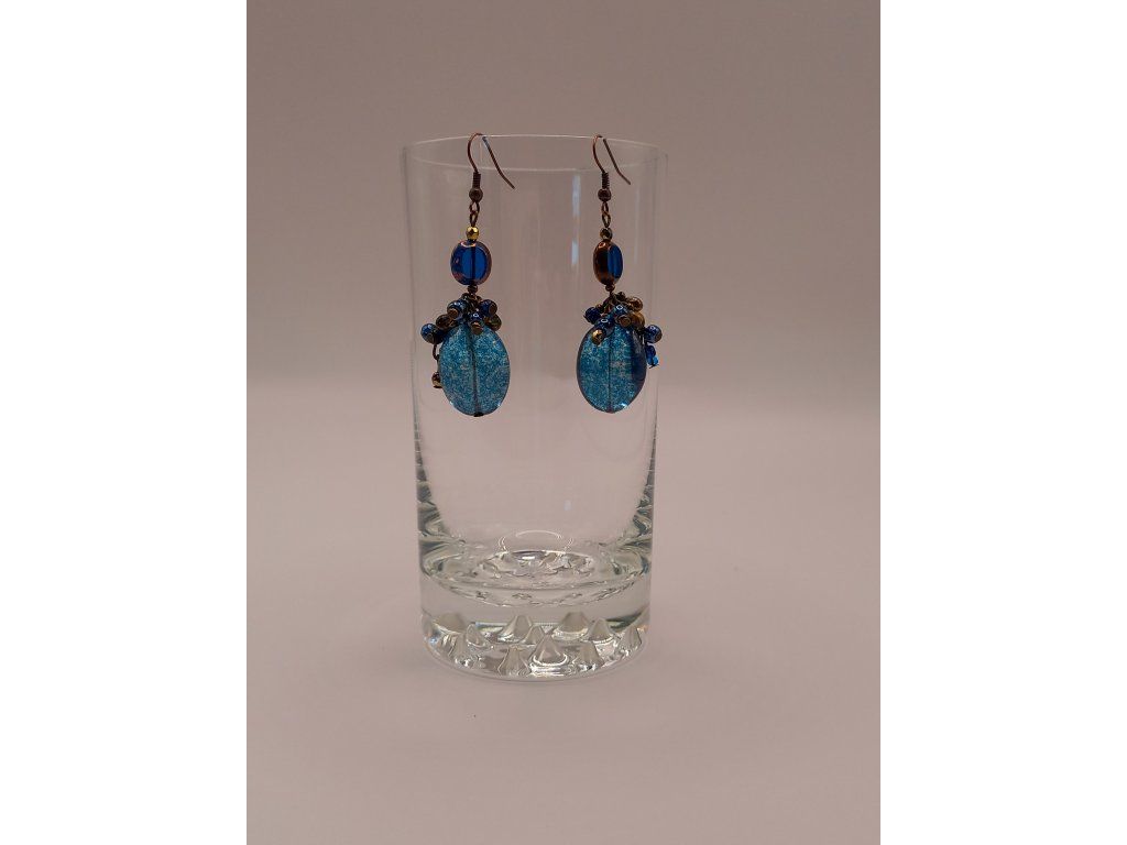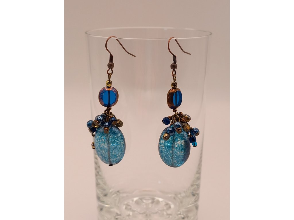 Nádherné náušnice „Modrá symfonie“ působí jako ladná skladba, která propojuje průsvitné modré oválné korálky o velikosti 2 × 1,5 cm s hlubokými tóny tmavě modrých skleněných korálků. Celek je podtržen tmavě měděnými komponenty, které dodávají šperkům nádech elegance a nadčasovosti. Náušnice jsou zavěšeny na praktických afroháčcích s bezpečnostní zarážkou, což zajišťuje pohodlné nošení.