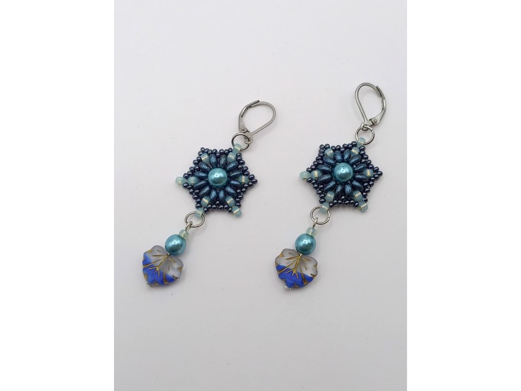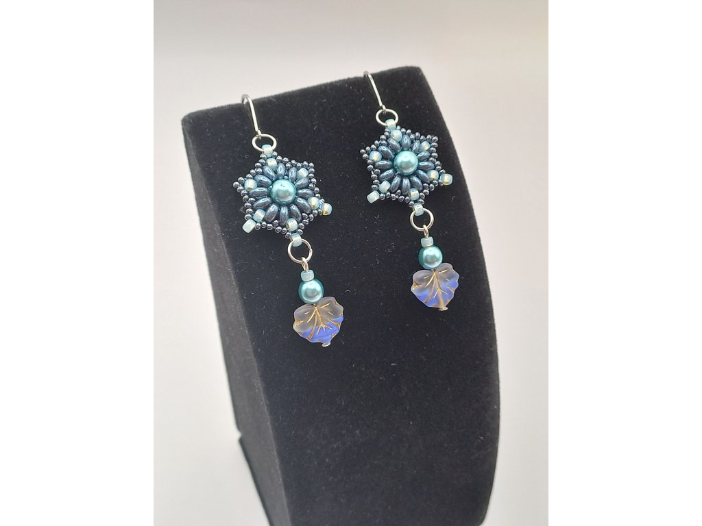 Barevná harmonie zimy. Šedomodré Superduo korálky, tyrkysově modré voskované perly a Matubo green aqua opal vytvářejí ledově svěží paletu. Zakončení v podobě lístku v matné bílomodré barvě dodává šperku jemnost a lehkost. Detail, který potěší.