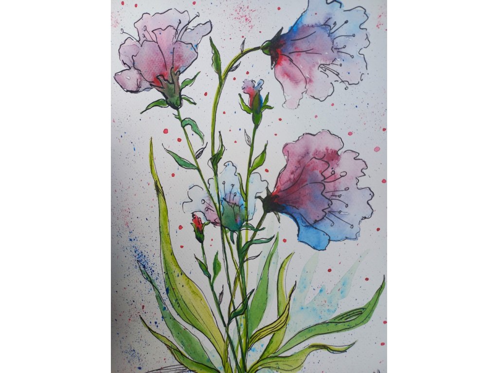 Něžná harmonie – akvarelový obraz formátu A4 zachycující fantazijní květy v odstínech modrofialové. Jemné tahy štětce a kombinace akvarelu s černou tuší vytvářejí snovou atmosféru inspirovanou přírodou, kde se barvy prolínají v harmonickém rytmu. Tóny modré a fialové symbolizují klid, rovnováhu a tajemnou krásu květin, zatímco technika dodává obrazu lehkost a éteričnost.