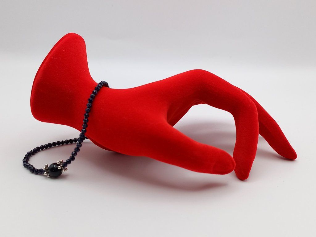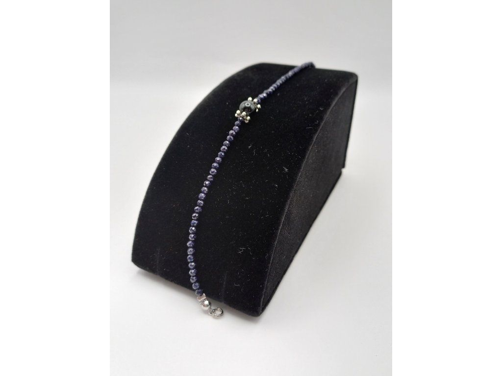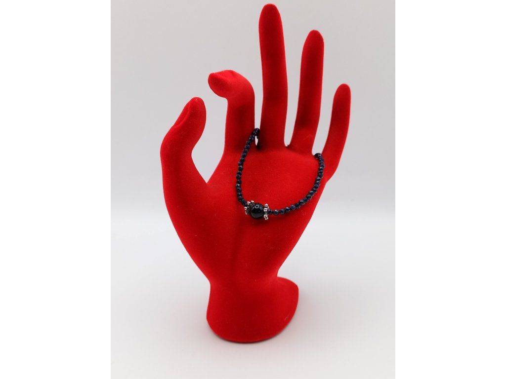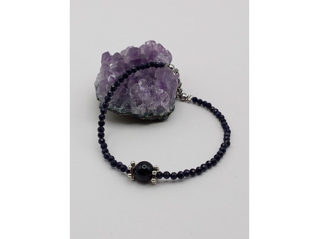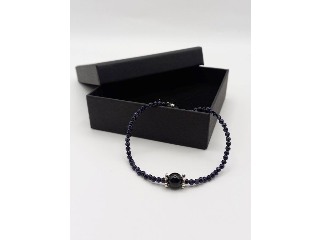 Elegantní náramek spojující mystiku a sofistikovanost. Jemný broušený korálek z modrého avanturínu (3 mm) dodává jemný lesk, zatímco dominantní achát černý/onyx (1 cm) přináší sílu a ochranu. Celkový design doplňují postříbřené bižuterní komponenty a karabinka z chirurgické oceli, která zajišťuje dlouhou životnost. Délka náramku: 21,5 cm.