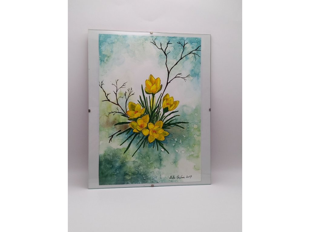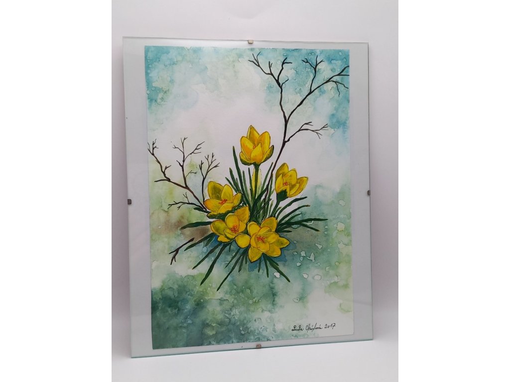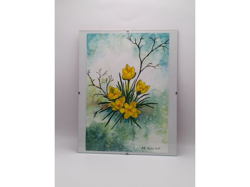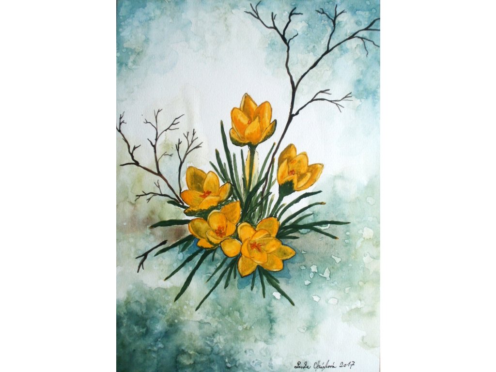 Jemná akvarelová malba zachycuje okamžik, kdy se zima začíná lámat a první jarní posly prorážejí zbytky sněhu. Uprostřed kompozice vyrůstá shluk žlutých krokusů – drobných, ale odhodlaných květů, které přinášejí světlo do chladné krajiny. Kolem nich se vine několik suchých hnědých větviček, připomínajících ticho zimy, jež pomalu ustupuje.