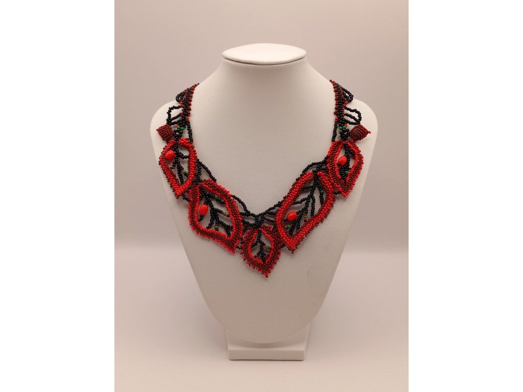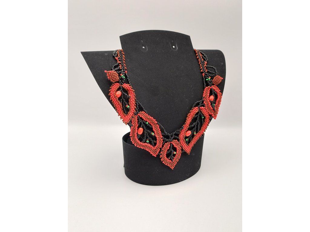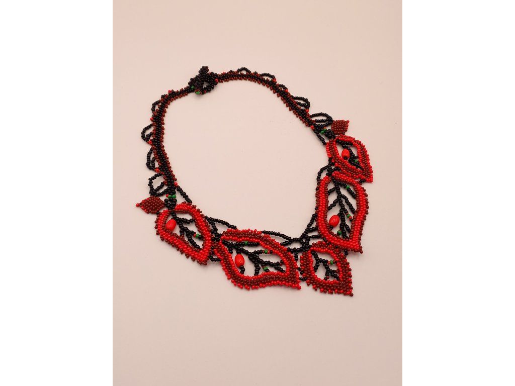 Náhrdelník je inspirován nádhernou paletou barev podzimu, kde zemité hnědé a vášnivé červené tóny tvoří dokonalou harmonii. Každý list je ručně vytvořen peyotovým stehem ze skleněného rokajlu značky PRECIOSA, což dodává šperku jedinečný detail a kvalitu. Jemně zelené akcenty působí jako přirozený kontrast, připomínající zbytky letní vitality uprostřed podzimního šera. Náhrdelník je vybaven originálním zapínáním šitým ve tvaru OT, což podtrhuje jeho jedinečnost. Vhodný i pro alergiky.