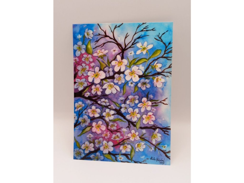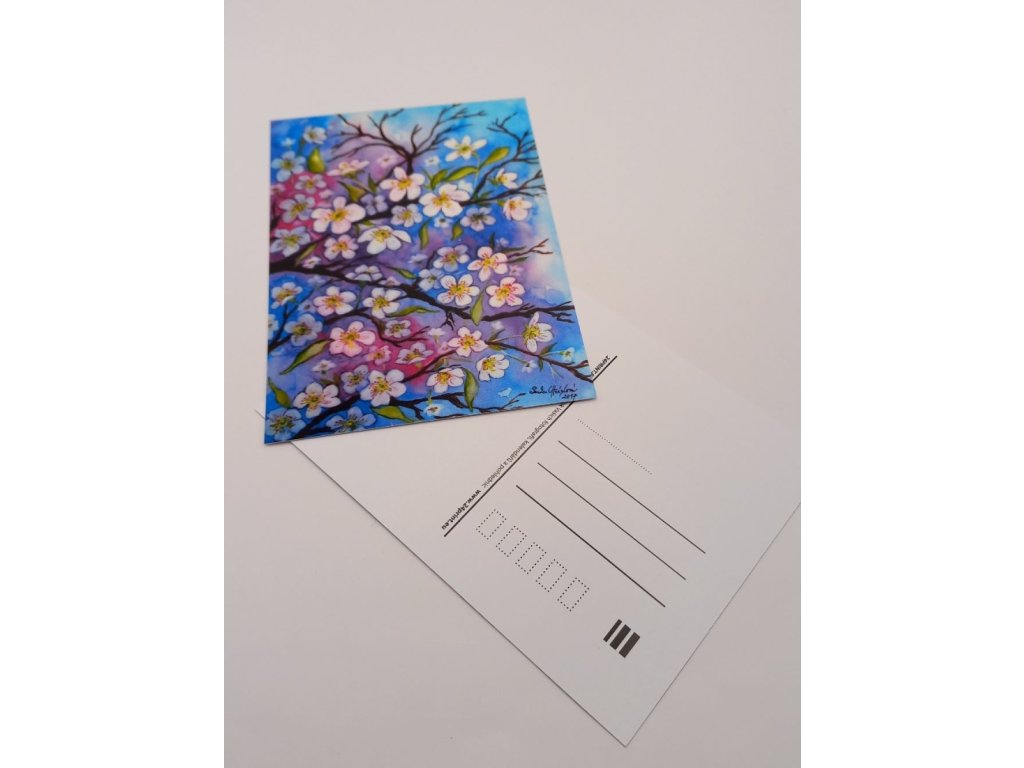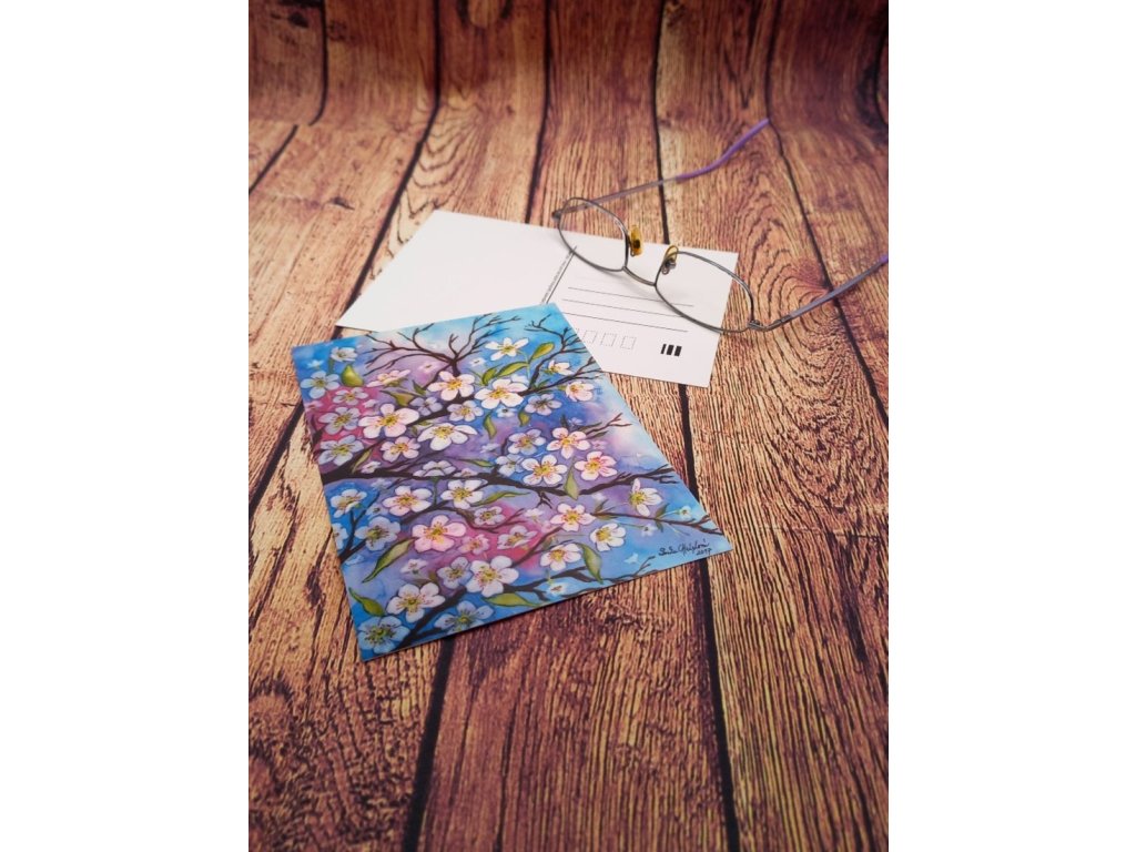 Jedná se o reprodukci na pohlednici, velikosti A6. Originální motiv vznikl rukou autorky ve formátu A4 a je přenesen na pohlednici z kvalitního polomatného papíru. Motiv podtrhuje něžnou jara.