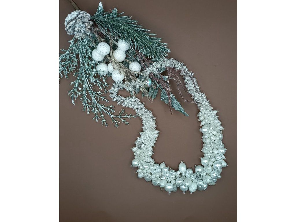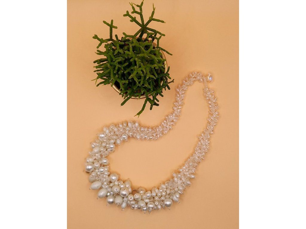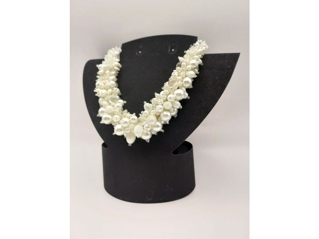 Půvabná jednoduchost bílých korálků na krk, které podtrhnou váš styl. Náhrdelník dodá pocit vyjímečnosti a jedinečnosti. Upoutá svým bohatým tvarem a bělostnou barvou. Autorský šperk je precizně zhotoven technikou šitého šperku z korálků. Použila jsem skleněné korálky různých tvarů a rokajl v barvě sněhově bílé a čiré. Celkově náhrdelník působí dojmem tvaru hroznu s korálky různých velikostí a tvarů, které jsou našity na dutince z korálků.